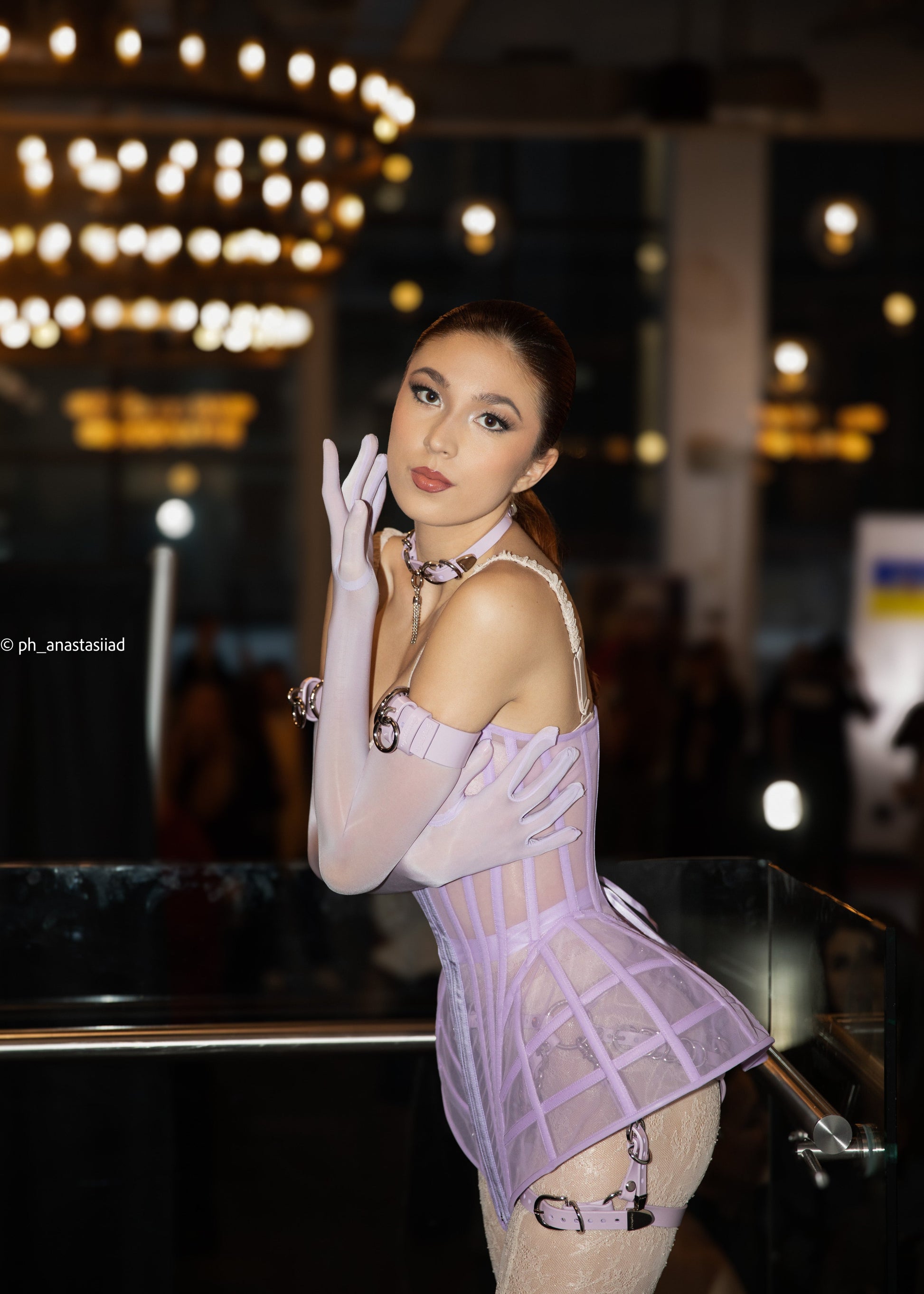 Lavender Mesh Corset with Dramatic Hip Panels – Structured Bustier with Back Lace-Up & Front Zipper